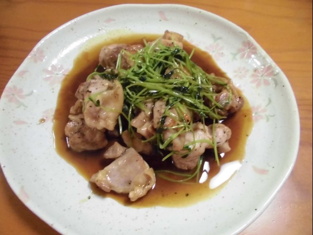 ↑鶏肉と豆苗の炒め物。バルサミコ醤油。夫の人にとても好評。