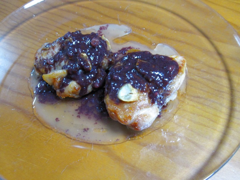 ↑鶏肉のにんにくソテー。赤ワインソースがけ。