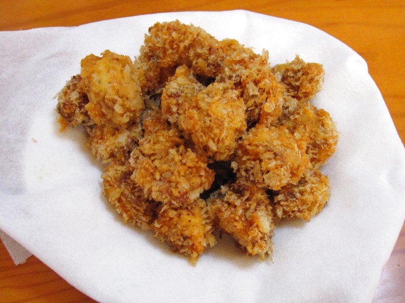 ↑うどんをゆでている間に、昨日の残りのひとくちカツをつまむ。
