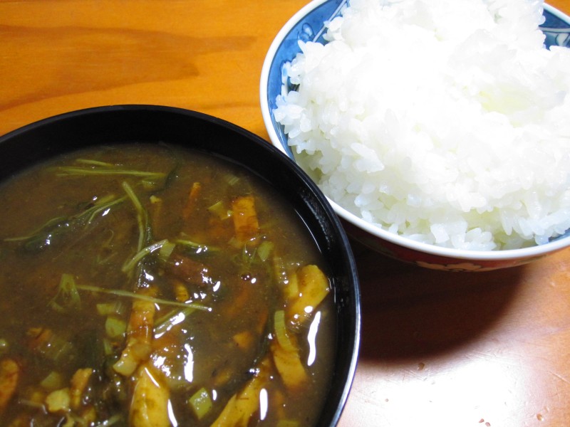 ↑夜ご飯。水菜かぶベーコンの野菜スープカレー・ご飯。