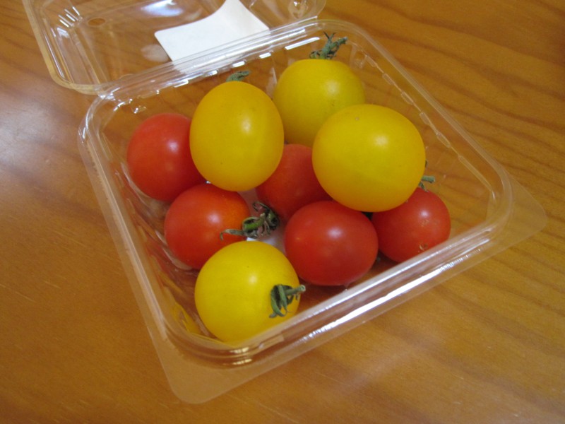 ↑カップ麺の出来上がりを待つ間、ミニトマトをつまむ。