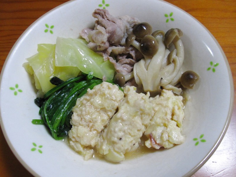 ↑キャベツ・豚バラ・しめじ・ほうれん草・鶏だんご。