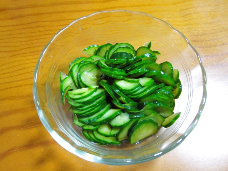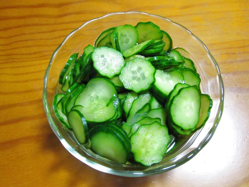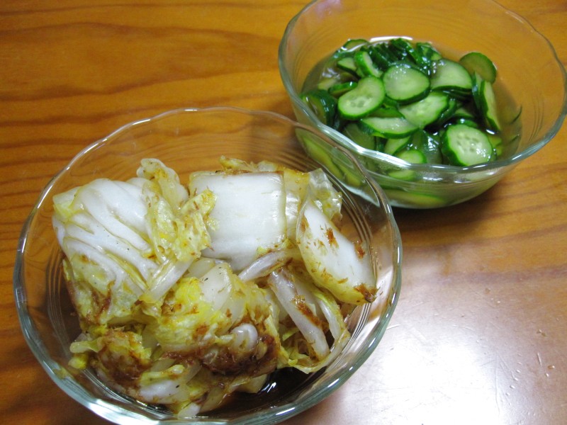 ↑白菜浅漬けと、昨日の残りのキュウリ浅漬け。