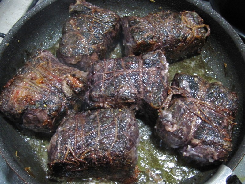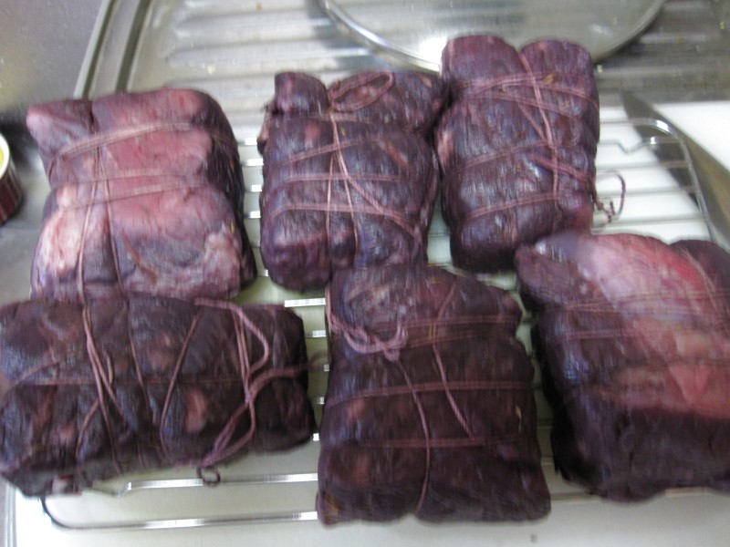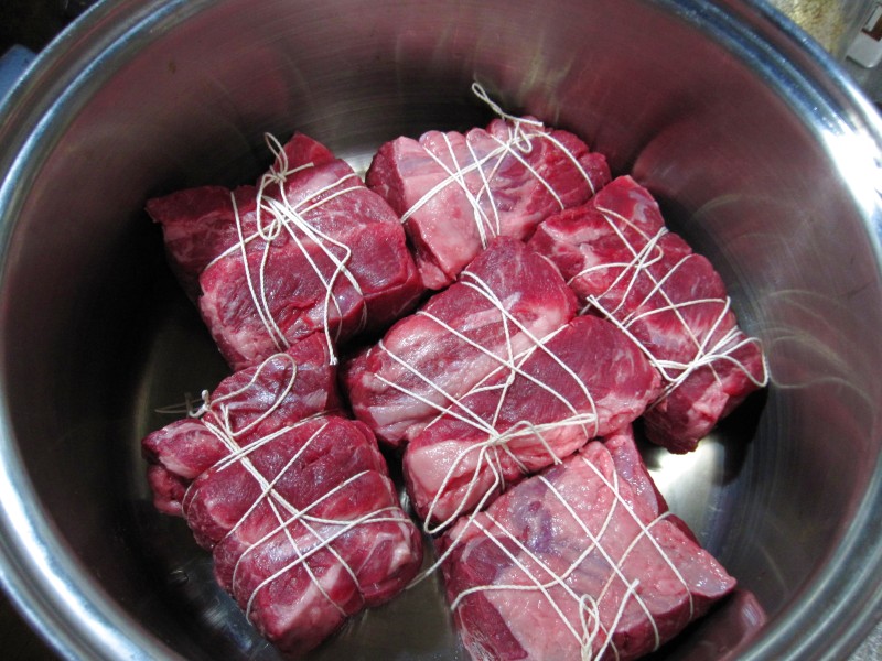↑肉のカタマリを、たこ糸でしばる。