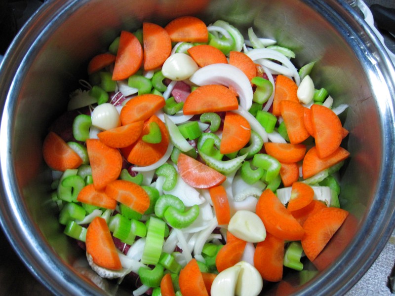↑並べた肉の上に、セロリ・玉ネギ・ニンジン・ニンニクなどのせて。