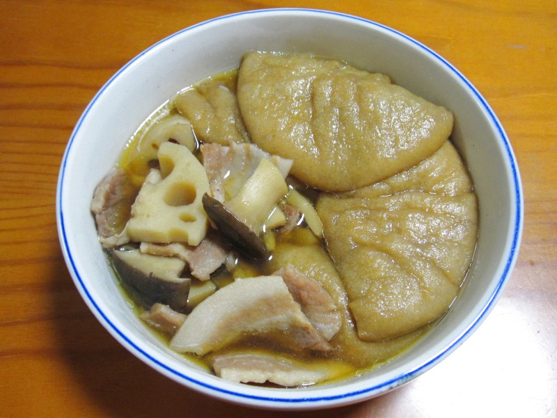 ↑岩船麩の煮物。蓮根・エリンギ・豚バラを一緒に煮た。