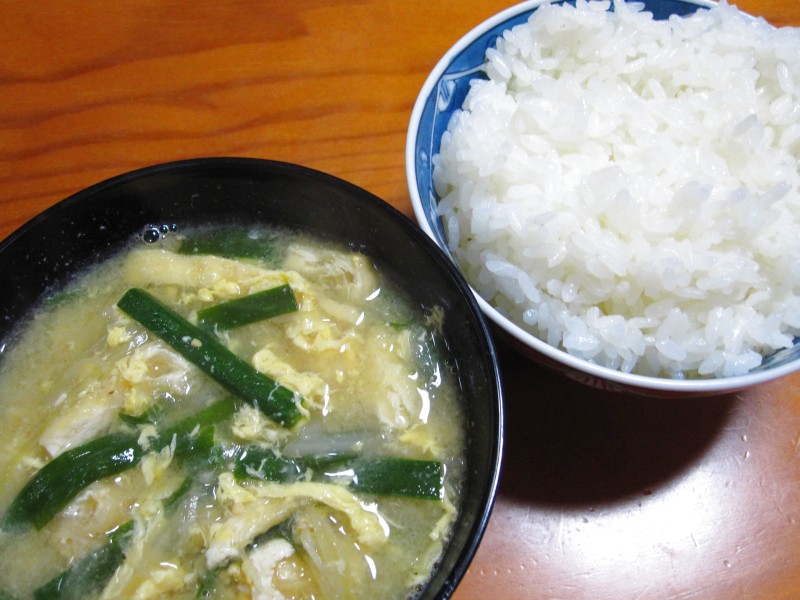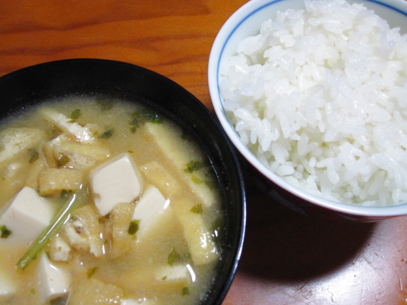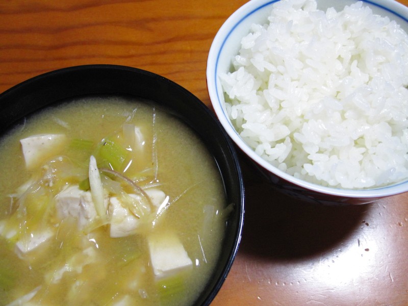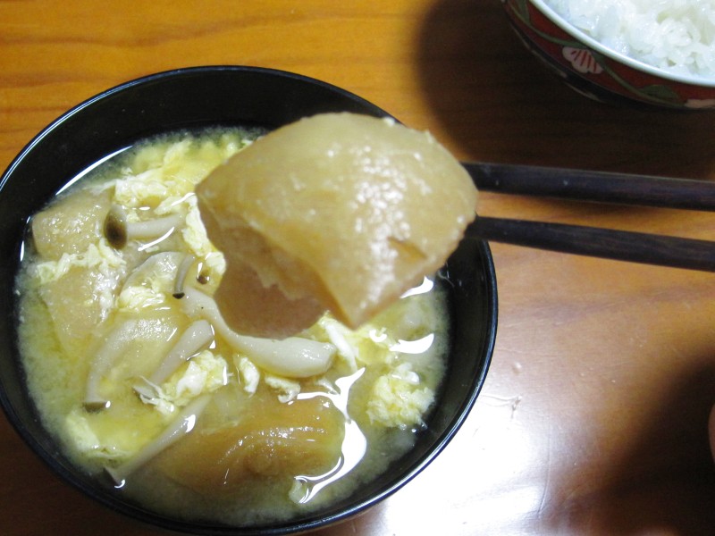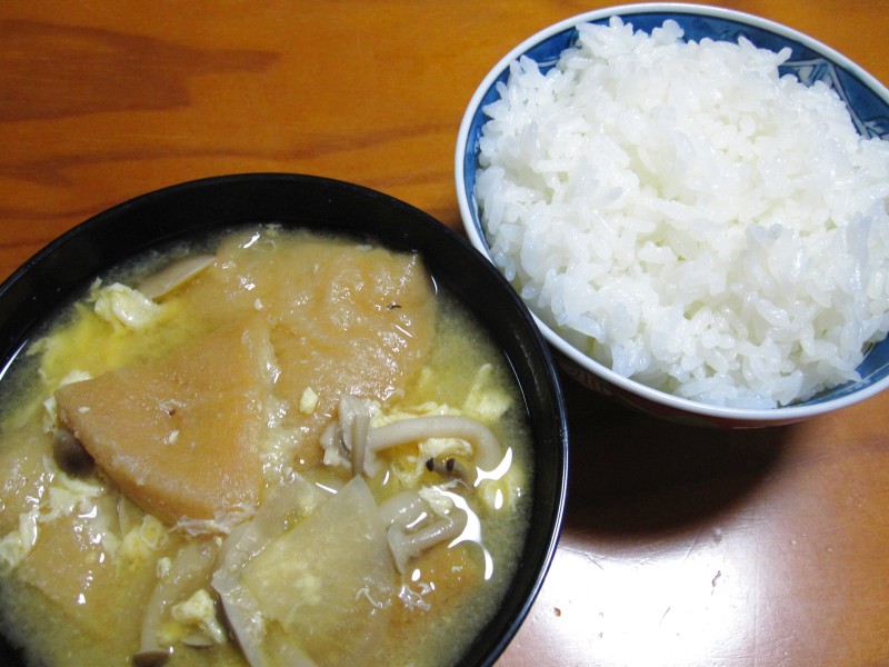 ↑夜ご飯。岩船麩・しめじ・大根・玉子の味噌汁。ご飯。