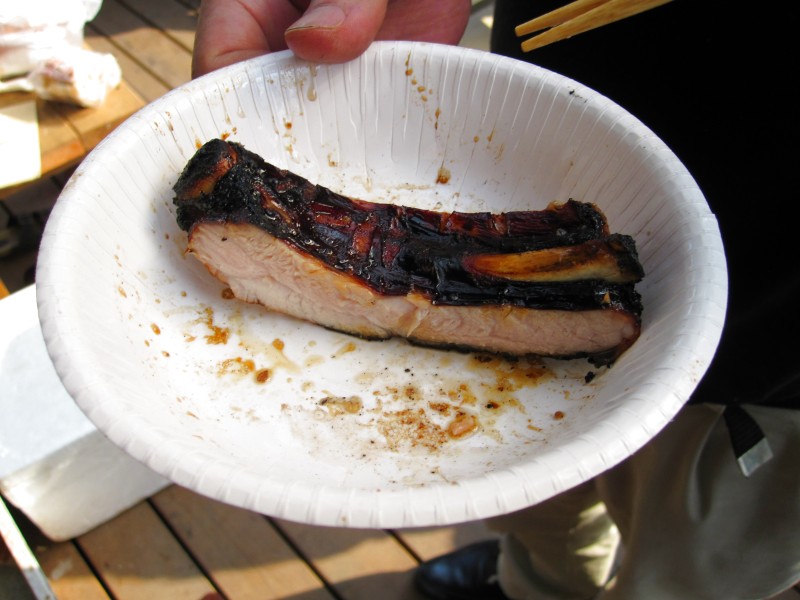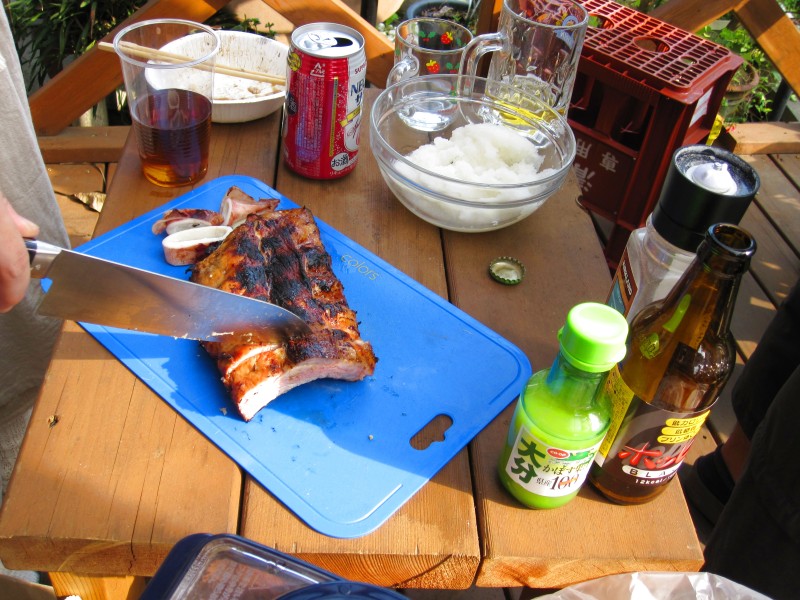 ↑こんがり焼けたスペアリブは、ザクザク切って。