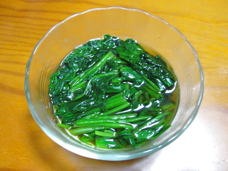 ↑ほうれん草のおひたし。漬け汁に、ポン酢を入れてみた。