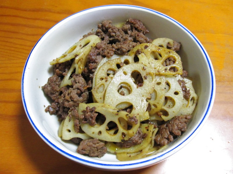 ↑ひき肉とレンコンの炒め物。にんにく醤油風味。