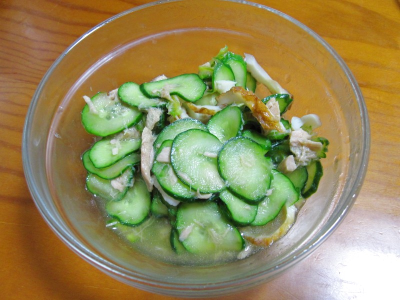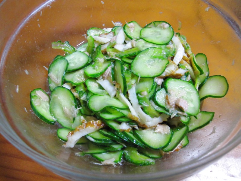 ↑ゴーヤとキュウリ・ちくわ・ツナのポン酢サラダ。うまうま。