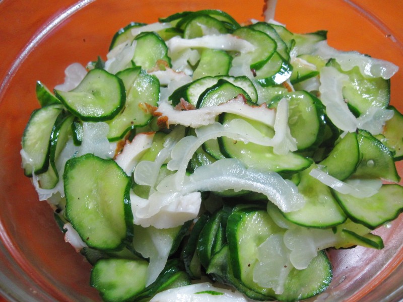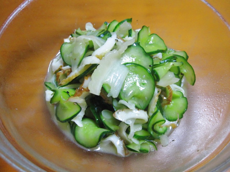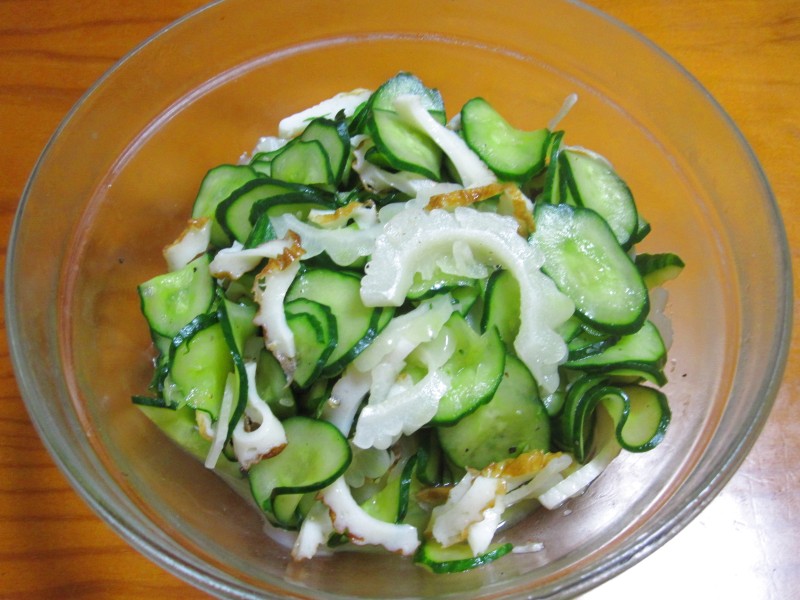 ↑キュウリ・ちくわ・白ゴーヤのサラダ。ほろ苦うま。