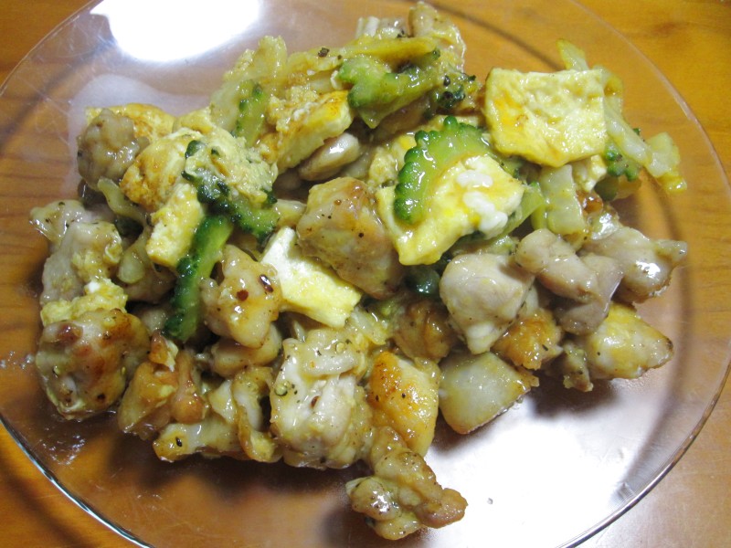 ↑ゴーヤちゃんぷるー。味噌味バージョン。夫婦の共同作業。