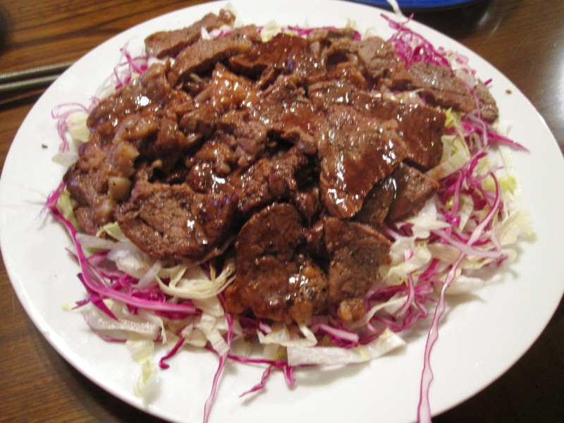 ↑牛肉を焼いたやつ。千切りキャベツの上にのっけて。