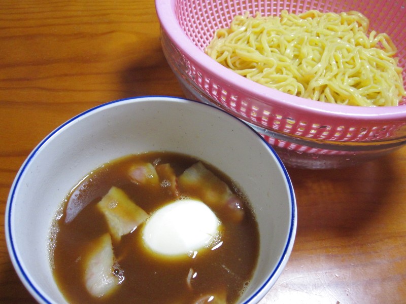 ↑つけ麺。つけ汁に、ベーコンとゆで玉子を入れてみた。