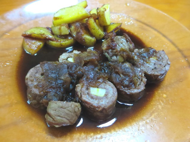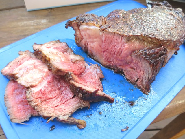 ↑焼けた牛塊肉は、ローストビーフっぽくスライス。