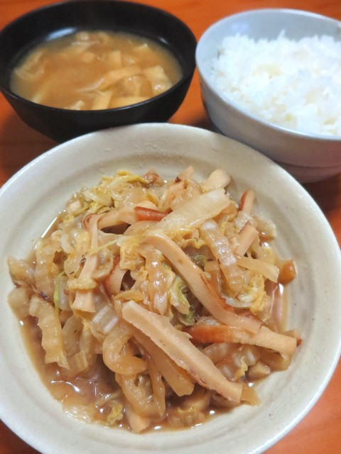 ↑夜ご飯。白菜スープ・ご飯・肉詰めピーマン。