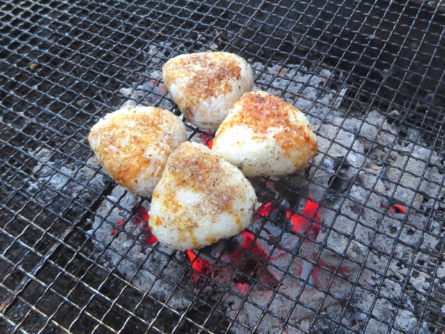 ↑焼きおにぎり。醤油の焼ける匂いが香ばしい。