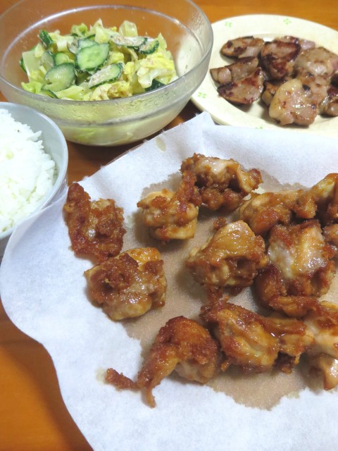 ↑夜ご飯。サラダ続き・ご飯・豚焼肉・鶏の唐揚げ。