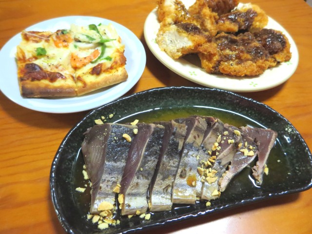 ↑夜ご飯。カツオたたき・下からもらったピザ・チキンカツ。