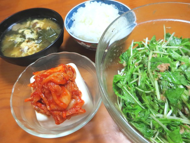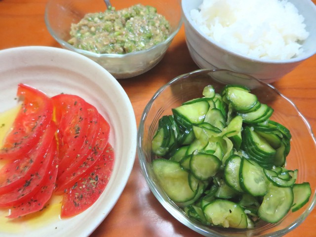 ↑トマトスライス・キュウリ浅漬け・オクラミョウガ・ご飯。