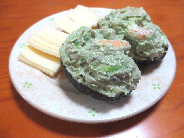 ↑夜ご飯。アボカドとエビのサラダ・チーズスライス。