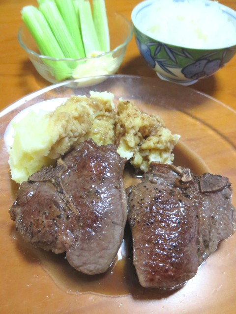 ↑夜ご飯。ラムロインチョップステーキ&マッシュポテト。