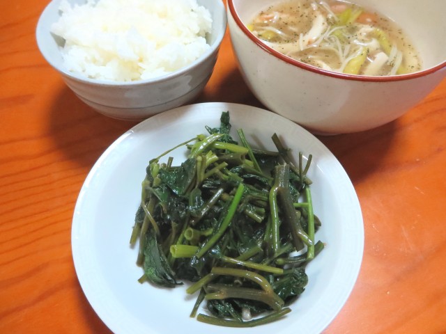 ↑夜ご飯。ご飯・スープ・空芯菜の炒め物。