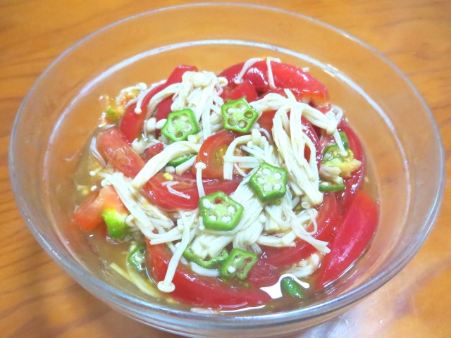 ↑トマト・えのき・オクラのサラダ。