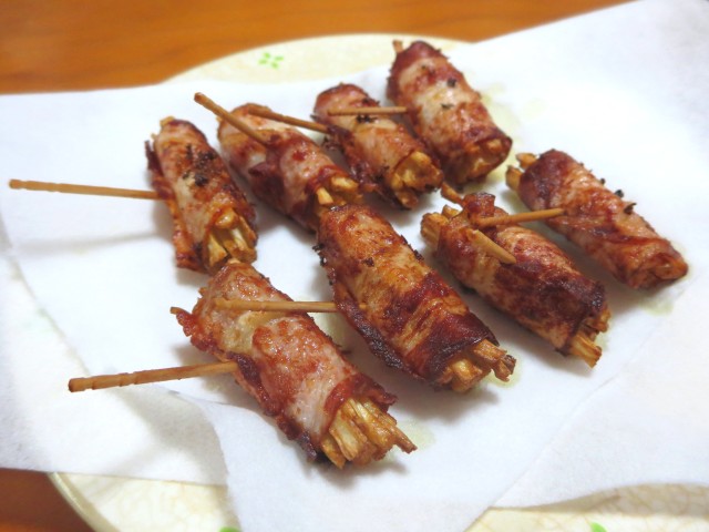 ゴボウをベーコンで巻いて、爪楊枝でとめて、油で揚げた。