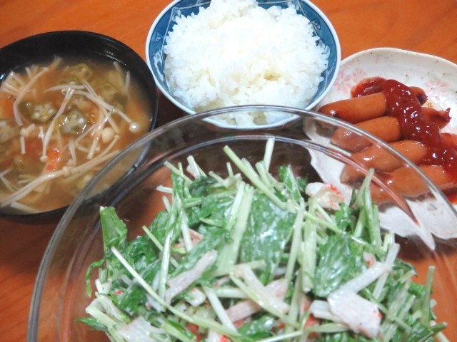 ↑スープ・ご飯・ウインナー・水菜カニかまサラダ。