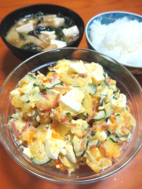 ↑夜ご飯。味噌汁・ご飯・ポテトサラダ。