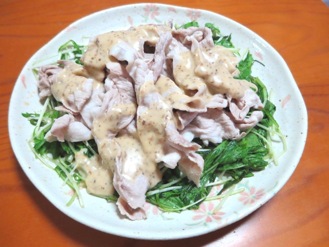 水気をしぼって皿に敷き、冷しゃぶをのせて、ゴマだれ。