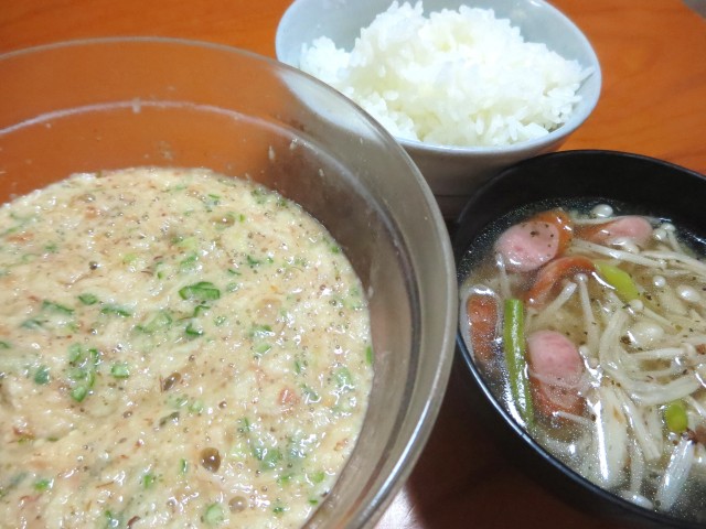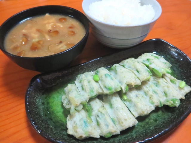 ↑夜ご飯。味噌汁・ご飯・枝豆天。