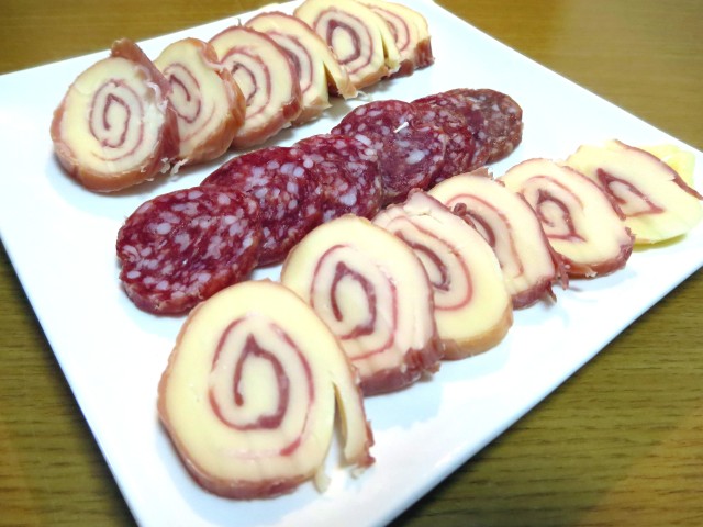 ↑生ハムチーズ巻きと、熟成した干し肉みたいなサラミ。