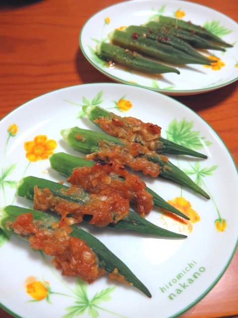 ↑今日はもう1品。焼きオクラ。2種の味付けで。