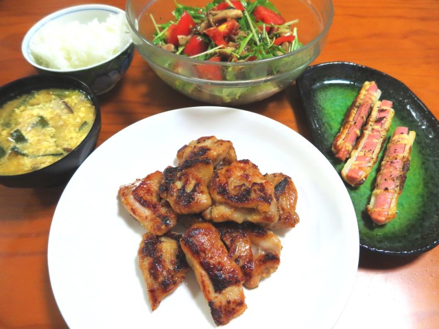 ↑夜ご飯。鶏の味噌漬け焼き・味噌汁・ご飯・サラダ・ちくわ。