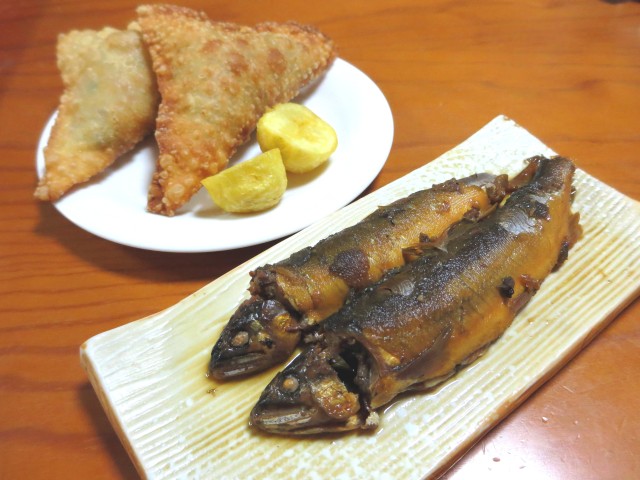 ↑夜ご飯。下からもらった鮎の甘露煮&パステル。