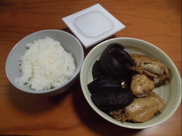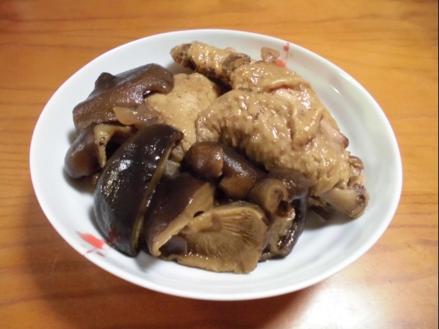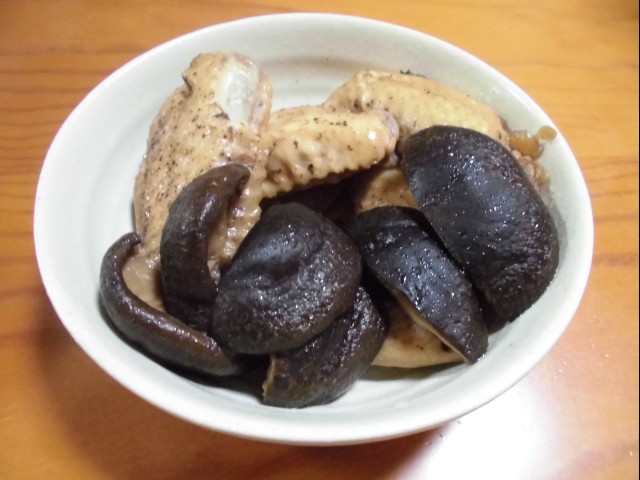 ↑干ししいたけと手羽の煮物。