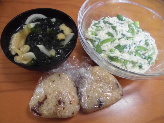 ↑昼ご飯。味噌汁・スナップエンドウ白あえ・炊き込みおにぎり。