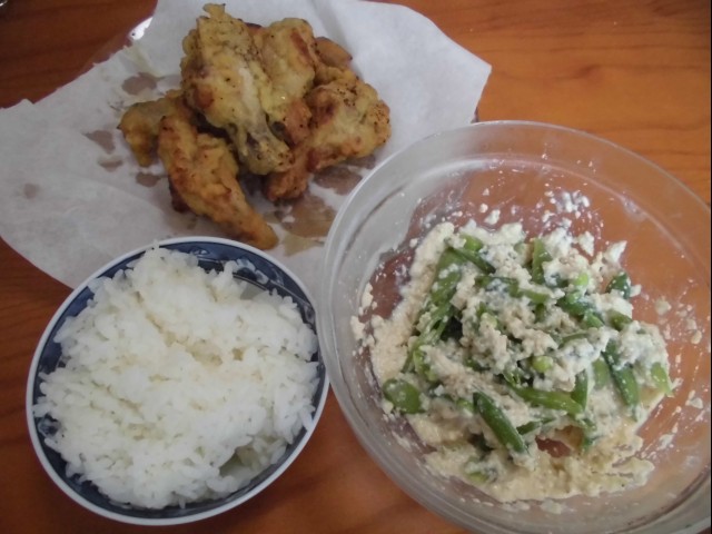 ↑昼ご飯。手羽元の唐揚げ・ご飯・スナップエンドウの白あえ。