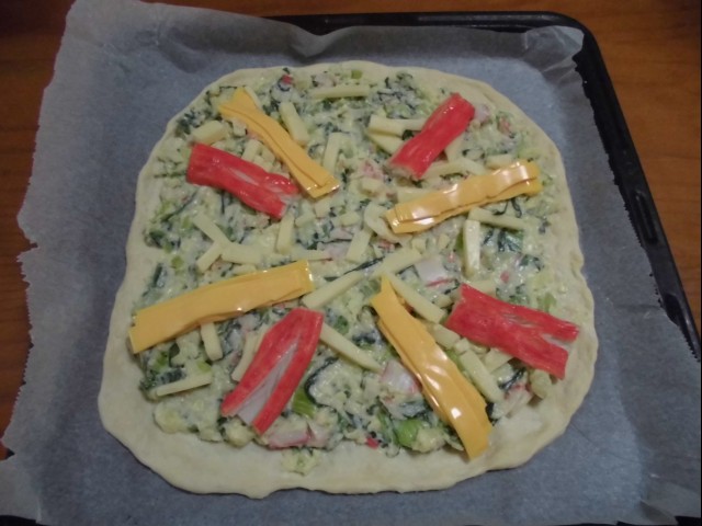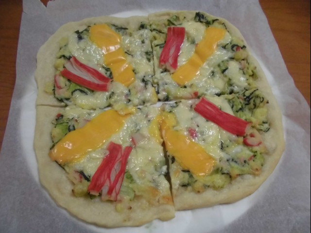 ↑ピザ焼く前、その1。カニクリームピザ。