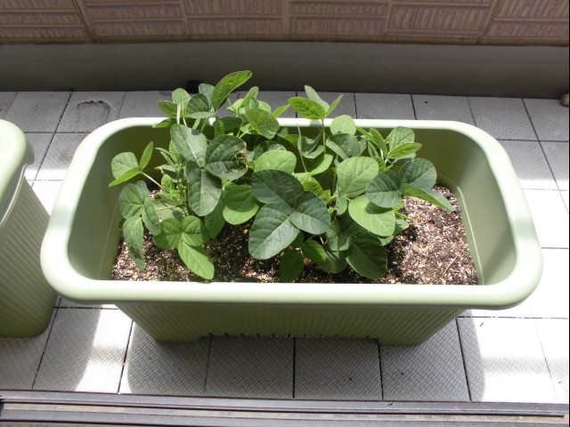 ベランダ栽培中の枝豆は、摘心したせいか、もっさりしてきた。