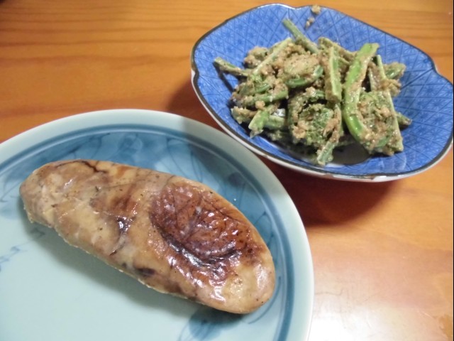 ↑下からもらった、焼いたふぐの卵と、こごみのゴマあえ。