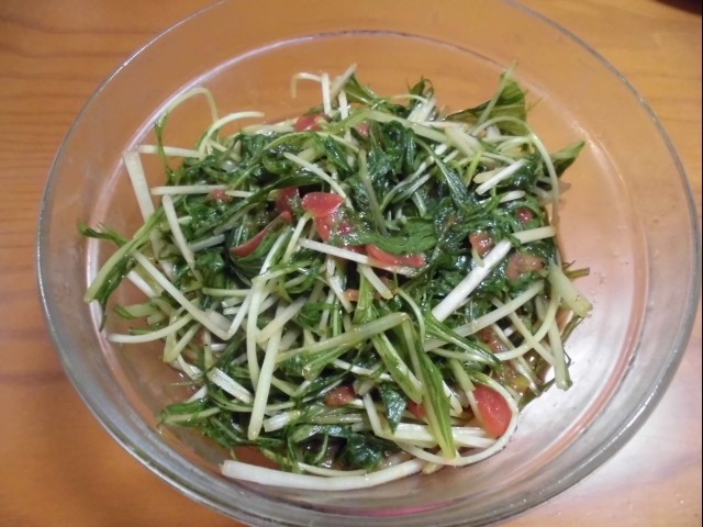 ↑水菜トマトサラダ。ゴマ油&醤油。夫の人に好評だった。