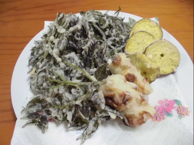 ↑下からもらった天ぷら。タラの芽・サツマイモ天・ちくわ天。
