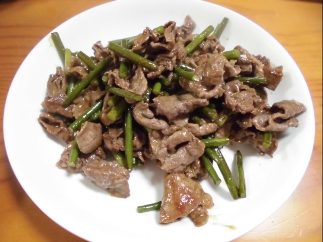 ↑牛肉とニンニクの芽の炒め物。夫の人が作ってくれた。うまうま。