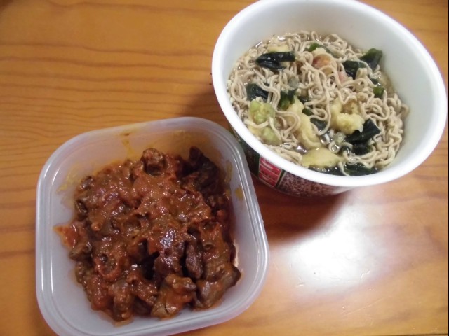 ↑帰宅して小腹が減ったので、カップそば&モツトマト煮。