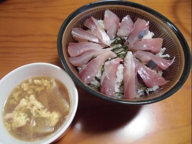 ↑夜ご飯。中華風かきたまスープ・イナダ丼。うまうま。