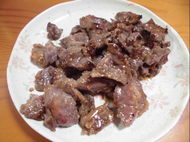 ↑牛肉を焼いたやつ。夫の人が焼く肉は、うまいなぁ。